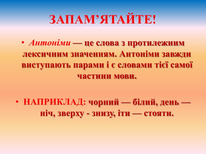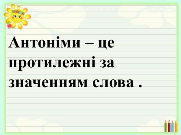 Антоніми — це слова, які мають протилежне значення, але належать до однієї частини мови. Наприклад: високий — низький, день — ніч, правда — брехня. Їхня сила у тому, що вони допомагають показати крайнощі, різницю, вибір.